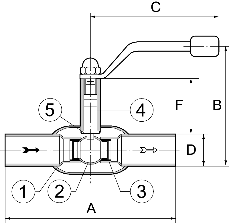 Helsvejst kugleventil med svejseender for direkte indsvejsning i rørsystemet. Med reduceret gennemløb.