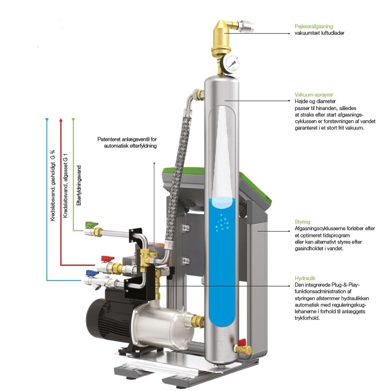 Selv Ved VarianEnde Drifttryk Arbejder Motorventilen Automatisk Efter Det Aktuelle Tryk,Som Sammen Med Et Spraymundstykke FordelerSystemVæskenTilVakuumrøretOG Herverververyer Afgasningen。De Frigivne Gasser udluftes tilatmosfærenfra denmonterede luftudlader at8060。