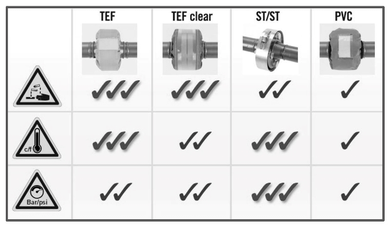 Anvendes på flanesamlinger, andre rørsamlinger og kompensatorer。我们的产品包括:湿气,油渍,汽油/燃料,糖浆。Anvendes på anlæg under tryk eller på anlæg med medier, hvor“spray”udslip kan medfører personskade eller品牌。Kan anvendes på anlæg med 98% svovsyre。