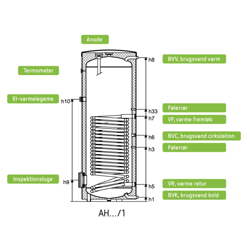 直到varmtvandsbeholder at85100 kan dertilkøbeselpatroner at85100eehr eller at851000hr为tilslutning i henholdsvis h10 og h9。Elpatronerfåsfås2kwtil 35 kw。