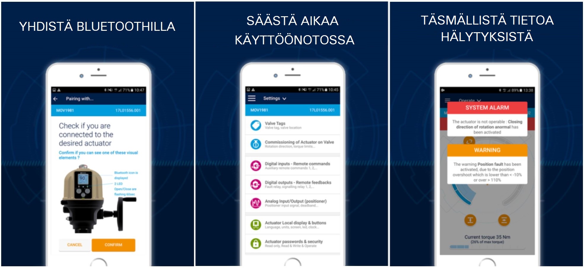 公元前-sovellus on havainnollinen ja se nopeuttaa käyttöönottoaikaa verrattuna sähkötoimilaitteen tavalliseen manuaaliseen käyttöönottoon verrattuna。Vain muutama painallus riittää perusparamtrien, kuten pyörimissuunnan tai momentin asetusten määrittämiseksi。Jopa monimutkaiset asetukset on tehty helpommaksi selkeän värien ja kaavioiden avulla。