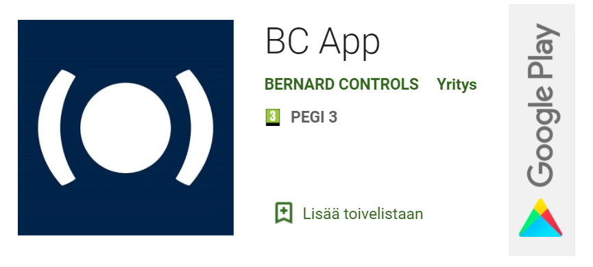 BC-applikaatio tarjoaa pääsyn Bernard Controls Assistance- ja Digital Library -kirjastoihin sekä laitteisiin liittyviin teknisiin dokumentteihin (kytkentäkaavio, mittapiirustus, asennus- ja käyttöopas)。