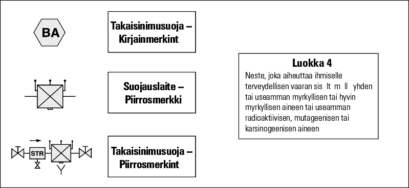 Takaisinvirtauksen suojauslaite tyyppiä BA kattaa luokan 4 riskin talousveteen liitettäessä。t.s. neste, joka aiheutta ihmiselle terveydellisen vaaran sisältämällä yhden tai useamman myrkyliisen tai hyvin myrkylien aineen tai useamman radioaktiivisen, mutageenisen tai karsinogeenisen aineen。