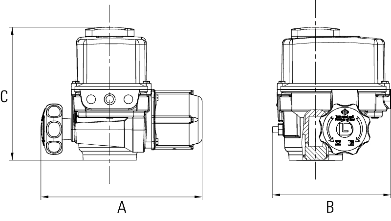 Reversibelt manöverdon i fyra storlekar, för vridning 0-90°,jussterbart genom en combination av vägberoende gränslägesbrytare, mekaniska lägesstopp och/eller momentbrytare。