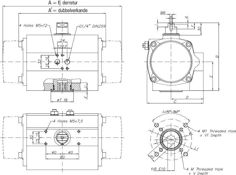 Montagefläns och spindelfyrkant borrade enl。ISO 5211 och DIN 3337。