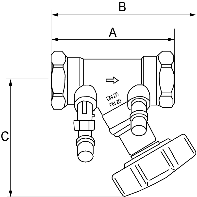 Gängad balanseringsventil med avtappning i avzinkningsbeständig mässing för balansering av flöden i värme- och kylsystem。Även lämplig på tappvatten för instrypning av VVC-slinga。Packningar三元乙丙橡胶