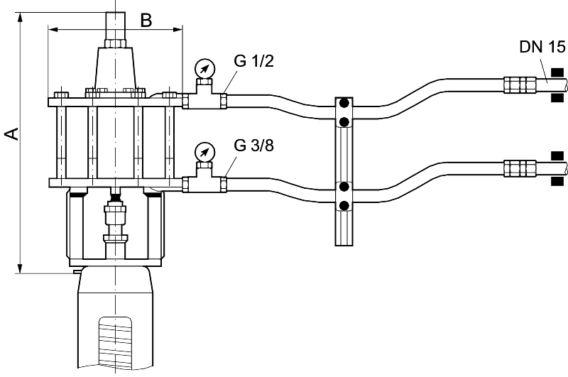 Manöverdonet styrs med tryckluft från en styrenhet via styrledningar。Styrenheten är försedd med tre压力计med pneumatiska brytarkontakter。