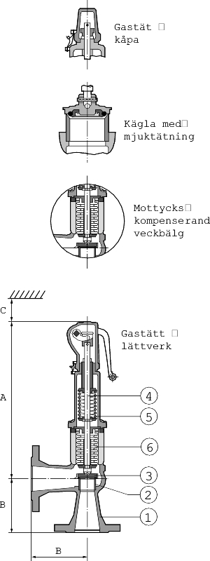 och anga种族。Lämplig som säkerhetsventil även vid varierande mottryck。Försedd med mottryckskompenserande och tätande rostfri syrafast veckbälg。
