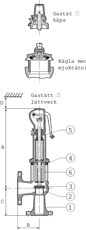 SäkerhetsventilMedHöglyftandeKaraktäristik。Flänsadeanslutnicatar。AVStåleller rostfritt syrafaststål。Mjuk- ellerMetallisktTätandeKägla。DN20 / 40-200 / 300(Rostfritt DN25 / 40-150 / 250),PN40。Mottryckskompenserandeveckbälgav rostfritt syrafaststål。